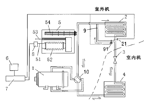 本發(fā)明公開了一種制冷、制熱的雙能源燃?xì)鉄岜每照{(diào)系統(tǒng)及運行方法,包括熱泵系統(tǒng),還包括一真空鍋爐換熱裝置、一溫度傳感器、以及一切換電路;真空鍋爐換熱裝置設(shè)置在室外,通過管道連接在熱泵系統(tǒng)的壓縮機和第一熱交換器之間,與其他部件處于同一循環(huán)系統(tǒng)中;溫度傳感器設(shè)置在室外,該溫度傳感器的輸出端與切換電路的輸入端電連接;切換電路根據(jù)溫度傳感器輸出的溫度信號控制真空鍋爐換熱裝置和第一熱交換器的交替啟閉。當(dāng)室外溫度降到設(shè)定溫度以下時,真空鍋爐裝置制熱,從而徹底解決了普通熱泵系統(tǒng)在冬天低氣溫的時候室外機從空氣中吸熱效率低下、以及結(jié)霜導(dǎo)致系統(tǒng)無法運行的問題。具有效率高、制熱效果好和降低用電高峰時電力系統(tǒng)的壓力的優(yōu)點。 |