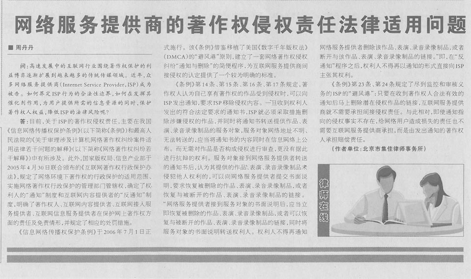 集佳律師文章《網(wǎng)絡(luò)服務(wù)提供商的著作權(quán)侵權(quán)責(zé)任法律適用問題》在《中國貿(mào)易報(bào)》發(fā)表