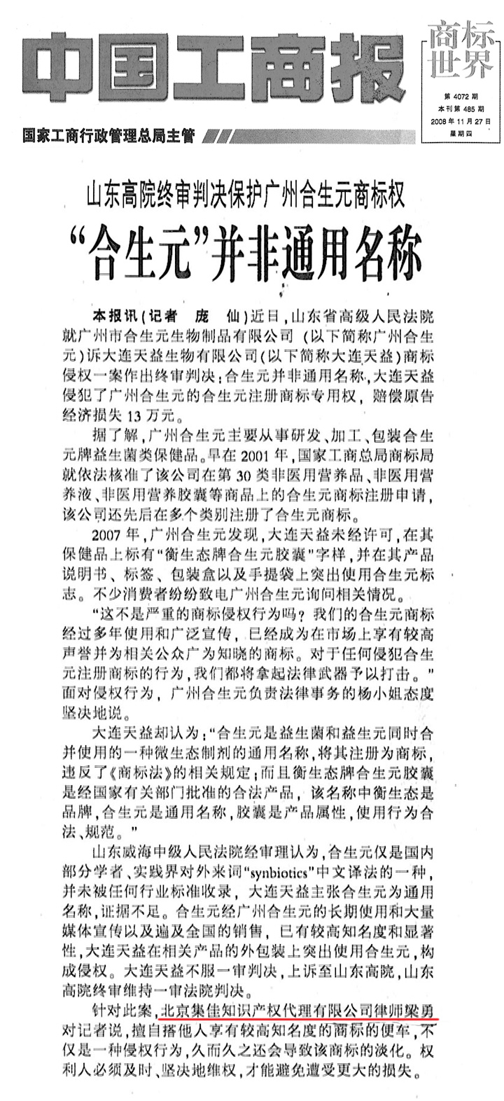 《中國工商報》:“合生元”并非通用名稱