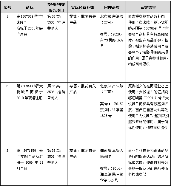 但對(duì)于熟悉商標(biāo)授權(quán)確權(quán)程序和商標(biāo)民事侵權(quán)訴訟的代理人而言,一個(gè)耐人尋味的現(xiàn)象是2011年至今全國(guó)各地法院審理的商標(biāo)民事侵權(quán)訴訟認(rèn)定結(jié)果卻與上述系列商標(biāo)行政訴訟認(rèn)定結(jié)果大相徑庭,例如:四川高院2011年和廣東高院2014年判決的好又多案【16】,北京知識(shí)產(chǎn)權(quán)法院2015年和2020年判決的大悅城和京客隆案【17】,湖南高院判決的友阿案【18】,山東高院判決的谷子案【19】等均無(wú)一例外認(rèn)為批發(fā)零售與推銷替他人構(gòu)成類似服務(wù)。對(duì)于這種商標(biāo)民事侵權(quán)與商標(biāo)授權(quán)確權(quán)兩程序中出現(xiàn)的差異,作為審理商標(biāo)授權(quán)確權(quán)行政訴訟的二審法院,北京高院知識(shí)產(chǎn)權(quán)庭在2017年《商標(biāo)授權(quán)確權(quán)行政案件相關(guān)疑難問(wèn)題的調(diào)研報(bào)告(三)》【20】一文中給予了回應(yīng),其認(rèn)為應(yīng)當(dāng)區(qū)分在商標(biāo)民事糾紛中對(duì)商標(biāo)專用權(quán)的保護(hù)和在商標(biāo)權(quán)撤銷復(fù)審行政糾紛中對(duì)商標(biāo)專用權(quán)維持有效制度的差異,在商標(biāo)民事侵權(quán)案件中,對(duì)商標(biāo)專用權(quán)的保護(hù)體現(xiàn)為“禁用權(quán)”所限定的范圍,其是以法律所規(guī)定的侵害他人注冊(cè)商標(biāo)專用權(quán)為基礎(chǔ),以是否會(huì)造成商品的來(lái)源混淆為落腳點(diǎn),而發(fā)生混淆的范圍不僅及于注冊(cè)商標(biāo)所核定使用的相同商品或服務(wù),也包括了類似商品或服務(wù),而對(duì)類似商品或服務(wù)的判斷,是從功能、用途、生產(chǎn)部門、銷售渠道、消費(fèi)群體、服務(wù)對(duì)象、內(nèi)容、方式等方面進(jìn)行的認(rèn)知。故商標(biāo)禁用權(quán)的范圍顯然超過(guò)了專用權(quán)。