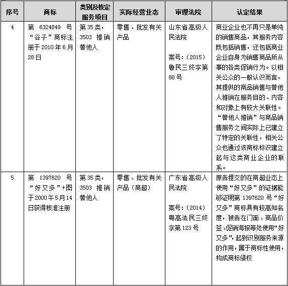 坦白地講,由于我國(guó)商標(biāo)注冊(cè)主管機(jī)關(guān)并未準(zhǔn)予在批發(fā)零售服務(wù)上注冊(cè)商標(biāo),因此司法機(jī)關(guān)當(dāng)然也不能越俎代庖。但根據(jù)“大悅城”、“好又多”、“京客隆”等商標(biāo)侵權(quán)案件在司法實(shí)踐中確立的規(guī)則可知,在遵守目前區(qū)分表的既有規(guī)定以及尊重商標(biāo)授權(quán)確權(quán)行政主管機(jī)關(guān)獨(dú)立行使審查權(quán)的情況下,可行的解決方案是,考慮到批發(fā)零售與推銷替他人之間客觀上存在密切的關(guān)聯(lián)關(guān)系,故,基于注冊(cè)商標(biāo)禁用權(quán)保護(hù)的需要,將批發(fā)零售與推銷替他人認(rèn)定為類似服務(wù),從而為那些在第35類推銷替他人服務(wù)上已注冊(cè)的知名度高、顯著性強(qiáng)的商標(biāo)提供對(duì)等保護(hù)。以下是選取的基于“推銷替他人”保護(hù)批發(fā)零售及的案例: