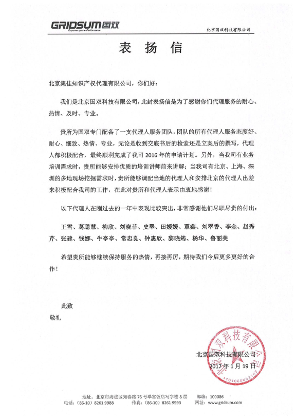 本次發(fā)來表揚信的是北京國雙科技有限公司,信中,客戶對楊五、王寶筠等專業(yè)人員的辛勤付出表示感謝,對集佳專業(yè)高效的服務、一絲不茍的工作態(tài)度表示認可。