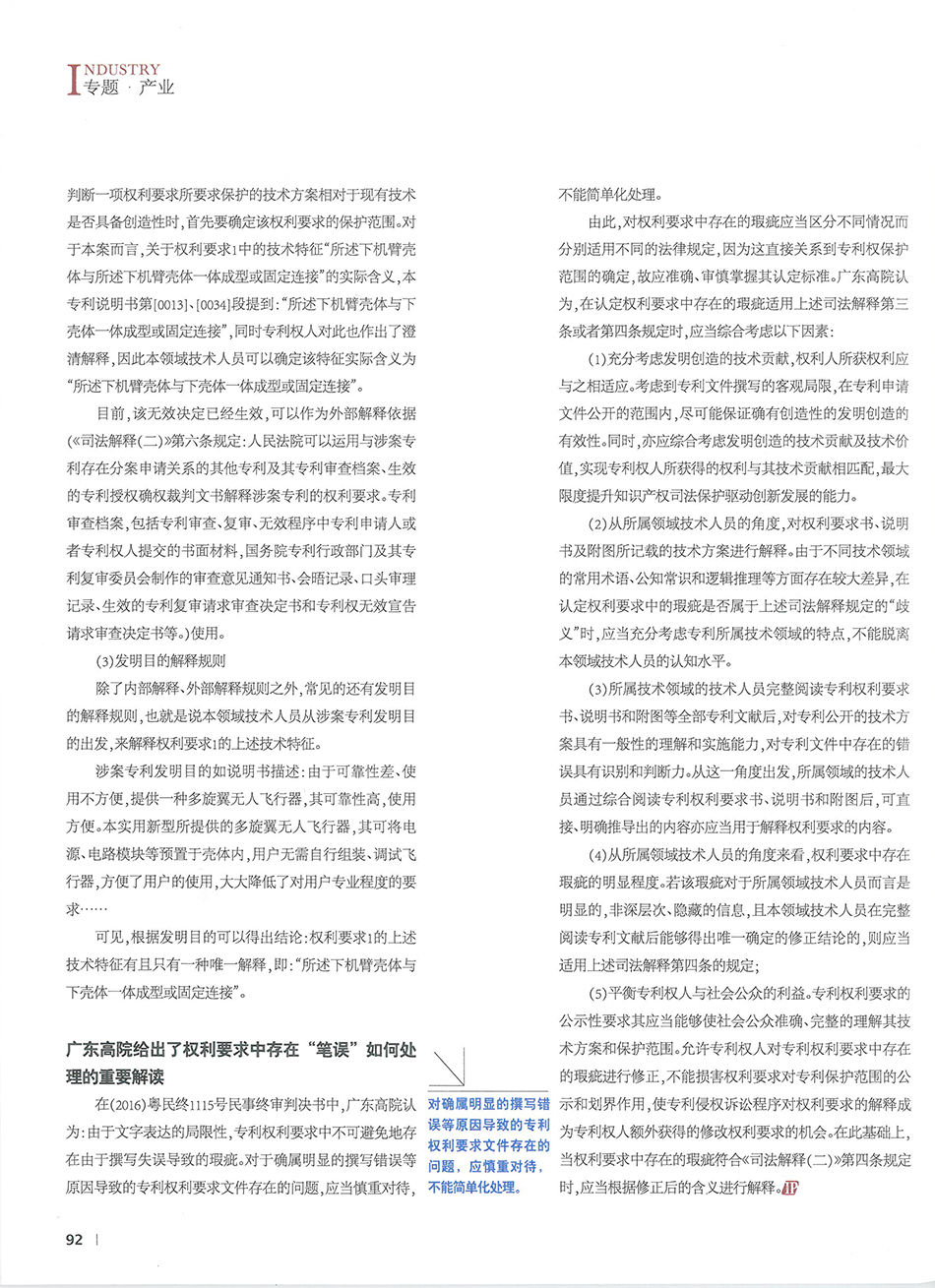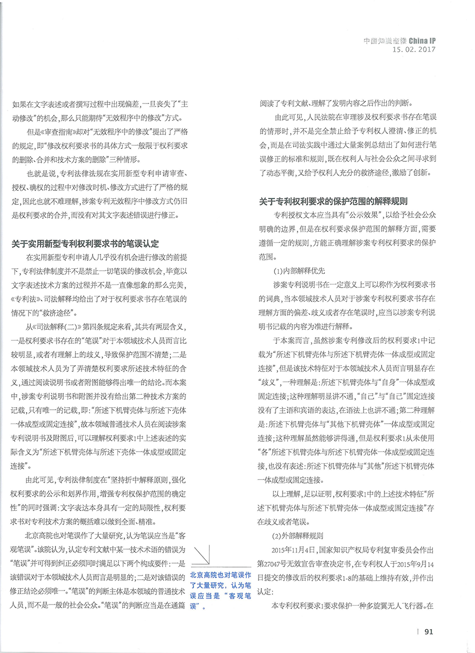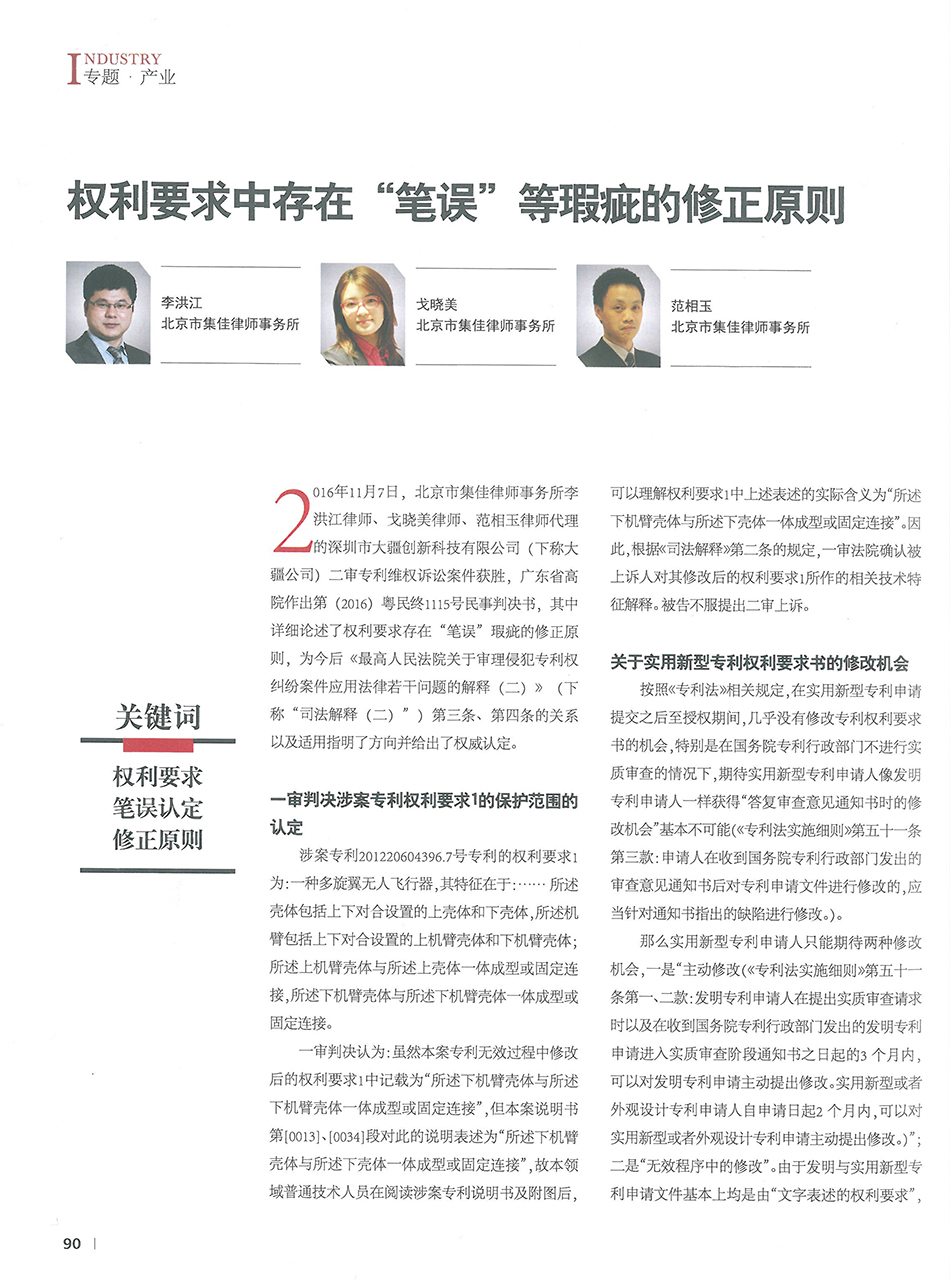 集佳文章《權(quán)利要求存在“筆誤”等瑕疵的修正原則》在《中國知識產(chǎn)權(quán)》發(fā)表