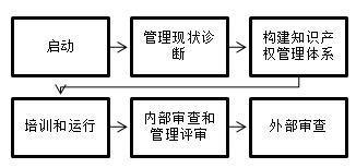 目前貫標(biāo)輔導(dǎo)咨詢,市場(chǎng)份額占比較大的有兩種模式:一種是基于咨詢機(jī)構(gòu)提供的一套符合國(guó)家標(biāo)準(zhǔn)的模板,企業(yè)根據(jù)知識(shí)產(chǎn)權(quán)的自身運(yùn)作形成記錄文件后爭(zhēng)取第三方認(rèn)可;另一種,是在咨詢機(jī)構(gòu)的全程輔導(dǎo)下,完成啟動(dòng)、管理現(xiàn)狀診斷、構(gòu)建知識(shí)產(chǎn)權(quán)管理體系、培訓(xùn)和運(yùn)行、內(nèi)部審查和管理評(píng)審、外部審查6個(gè)模塊(見圖1),系統(tǒng)的構(gòu)建知識(shí)產(chǎn)權(quán)管理體系。