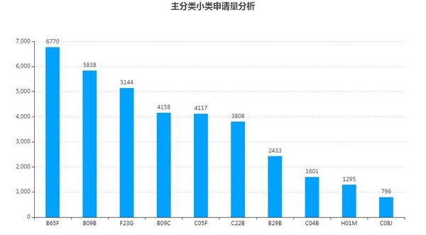 從固廢產(chǎn)業(yè)專利申請的技術(shù)分類看,熱點領(lǐng)域集中在B部(作業(yè)、運輸)、C部(化學、冶金)和F部(機械工程等)。按申請量排序的小類為B65F(家庭的或類似的垃圾的收集或清除)、B09B(固體廢物的處理)、F23G(焚化爐;廢物或低品位燃料的焚毀)、B09C(污染的土壤的再生)、C05F(不包含在C05B、C05C小類中的有機肥料,如用廢物或垃圾制成的肥料)和C22B(金屬的生產(chǎn)或精煉)。這六類的申請量合計29835件,大約占據(jù)分析專利總量的80%左右。