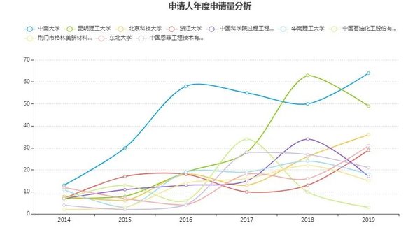 分年度看,如圖5,申請人在近些年的申請趨勢總體變化不大。其中中國石油化工股份有限公司的申請量在2017年達到高峰后,近兩年有所下降;而昆明理工大學在2017年之后、浙江大學和東北大學在2018年之后都有明顯的發(fā)力,這可能表明各個申請人在相應領(lǐng)域的研發(fā)成果有所波動,其更深的后果有待更多觀察。