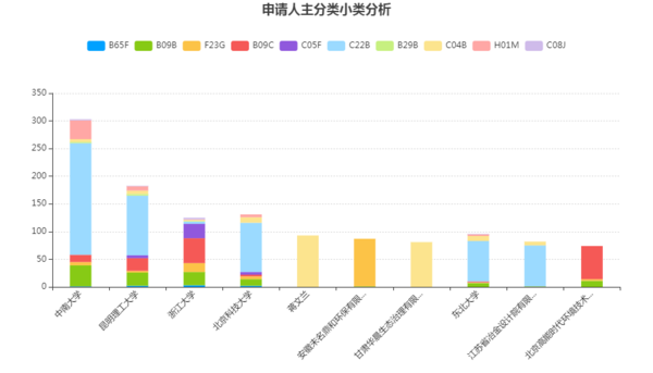 安徽未名鼎和環(huán)保有限公司的申請全部為F23G(焚化爐;廢物或低品位燃料的焚毀),這和該公司的主營業(yè)務(生活垃圾熱解)保持一致。浙江大學、北京高能時代環(huán)境技術(shù)股份有限公司的專利申請以B09C(污染的土壤的再生)為主。值得注意的是,在本小節(jié)分析的十個主體中,浙江大學的技術(shù)分類分散程度最高,顯示出其在多個技術(shù)方向上的發(fā)展較為均衡,體現(xiàn)出較強的綜合實力。此外,據(jù)查詢,高能時代公司是土壤修復產(chǎn)業(yè)的龍頭公司,其在污染土壤的再生領(lǐng)域擁有較強的研發(fā)實力。