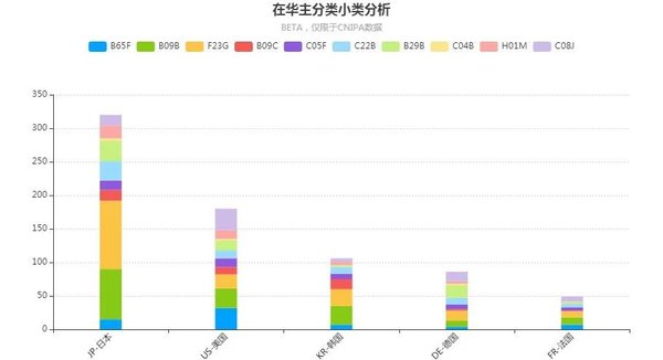 由上文可知,國外申請人在國內(nèi)固廢領(lǐng)域的布局較少,前五個布局國家各自的技術(shù)布局如圖7所示。由圖可知,除了日本存在兩個較明顯的優(yōu)勢小類布局之外,其余幾個國家的技術(shù)布局雖然各有側(cè)重,但均比較分散。與圖2相比,五個國外申請主體中只有美國以B65F(家庭的或類似的垃圾的收集或清除,其在分析專利總量中排名第一)為主,部分反映出美國企業(yè)在固廢收集方面的出海優(yōu)勢。還注意到,日本企業(yè)以F23G(焚化爐;廢物或低品位燃料的焚毀)和B09B(固體廢物的處理)為主進行布局,這與日本在垃圾焚燒和處理方面的技術(shù)成熟程度一致。