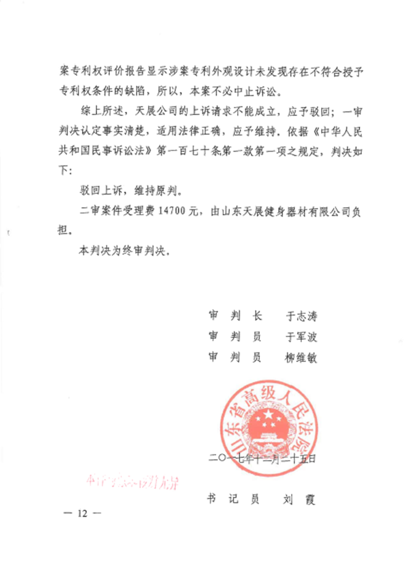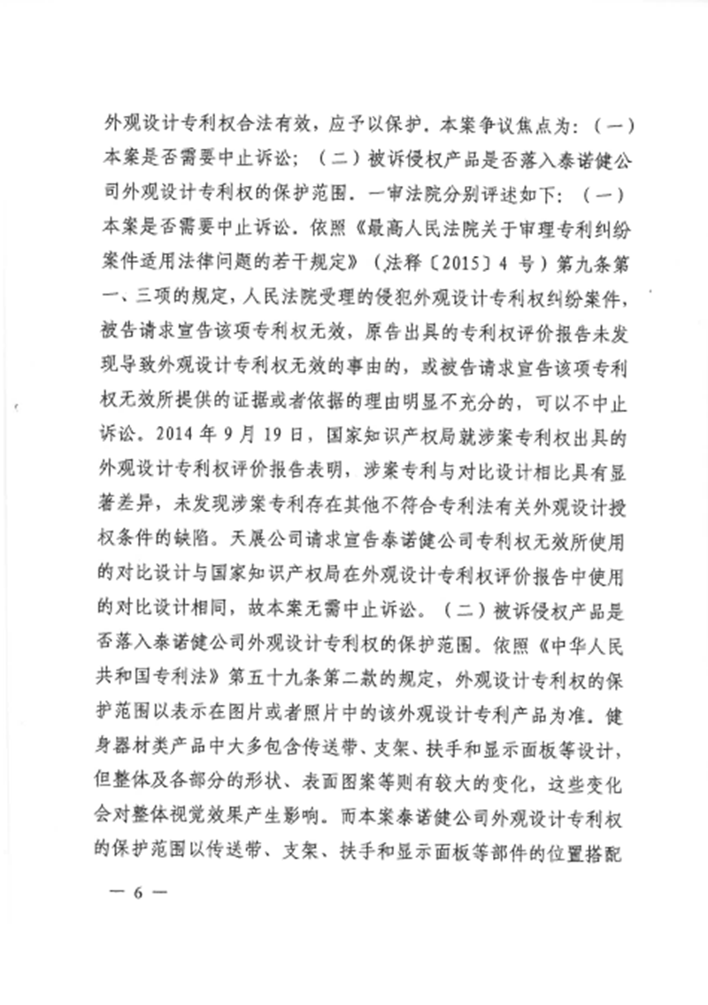 集佳代理意大利泰諾健公司訴山東天展健身器材有限公司(以下簡稱“天展公司”)侵害外觀設計專利權糾紛一案,經濟南中院一審((2016)魯民初1656號)、山東高院二審((2017)魯民終797號),我們已于近日收到由山東高院做出的終審判決。山東高院駁回被告上訴,維持一審判決,認定被告天展公司生產、銷售、許諾銷售的被控侵權跑步機產品落入涉案專利權保護范圍,并支持了原告泰諾健公司主張的停止侵權行為、賠償經濟損失及合理維權費用等請求。