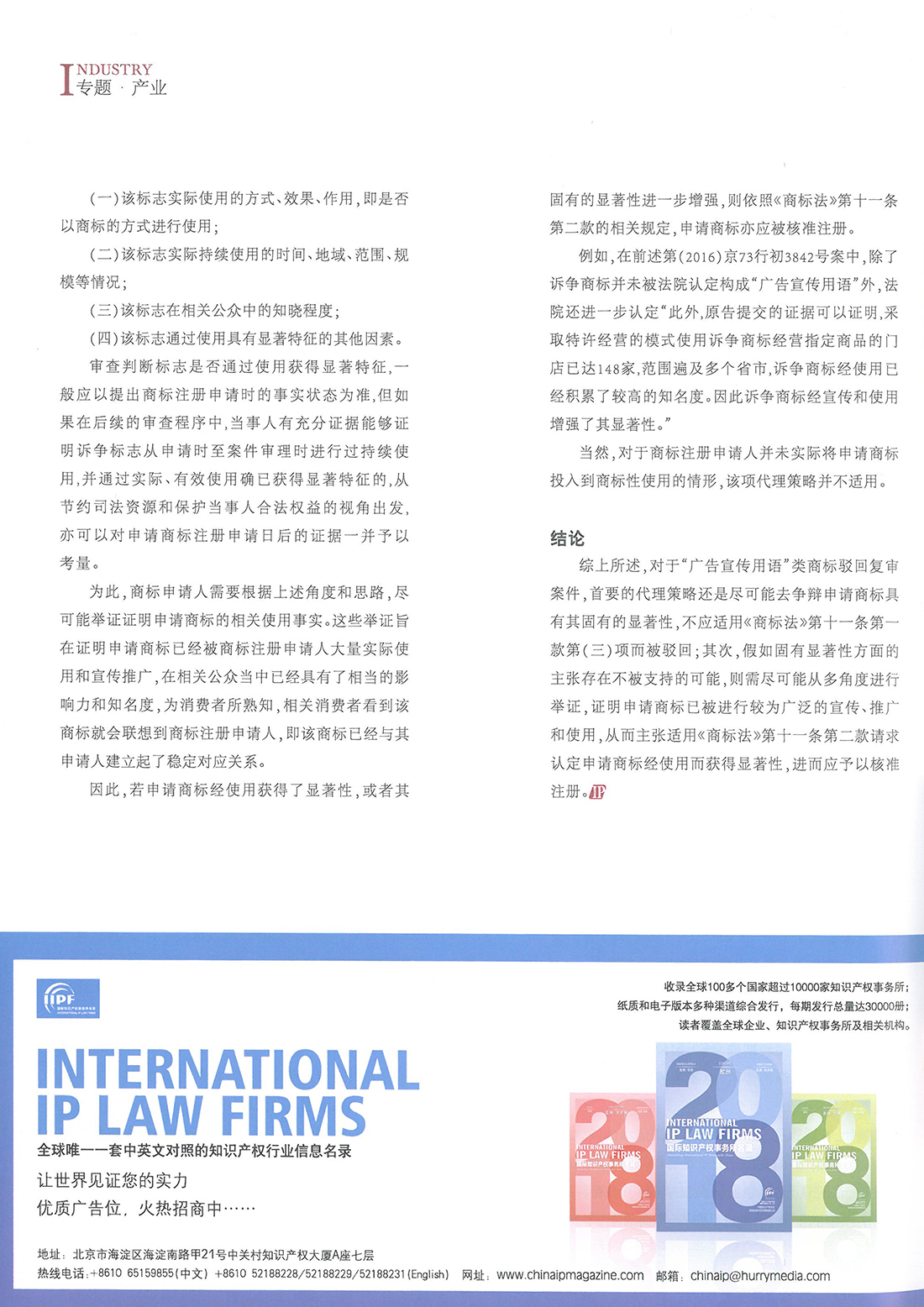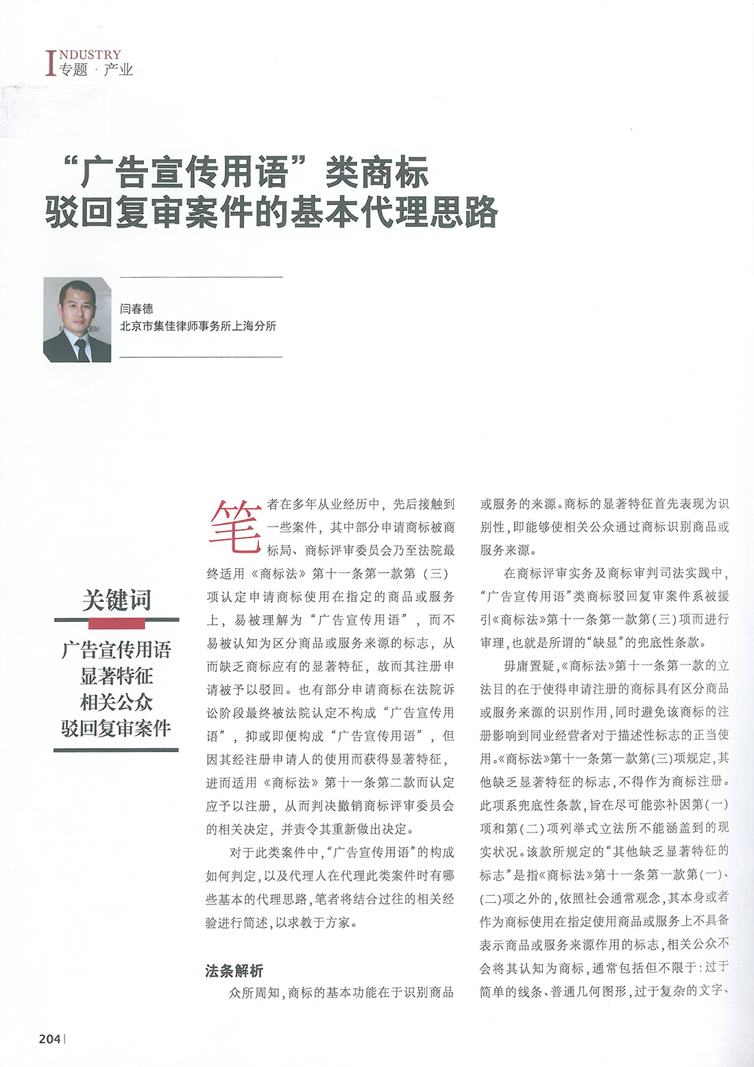 集佳文章《“廣告宣傳用語”類商標駁回復審案件的基本代理思路》在《中國知識產(chǎn)權》發(fā)表
