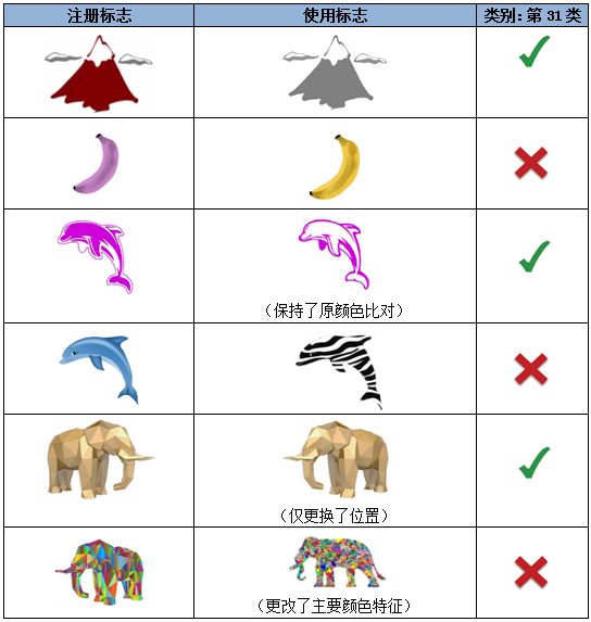 對于純圖形商標而言,顯著性來源于特定形式中的圖形要素。因此,對圖形的更改很可能會改變注冊標志的主要顯著特征,除非它涉及的并非對標志顯著性至關重要的特征(例如顏色,形狀等)。但若顏色系構成顯著特征的來源(如以下示例七第二組),則顏色的改變也將視為注冊商標的實質變更。如果純圖形商標的顯著性很低,則即使對商標進行很小的改動也可能導致其顯著性的實質改變。
