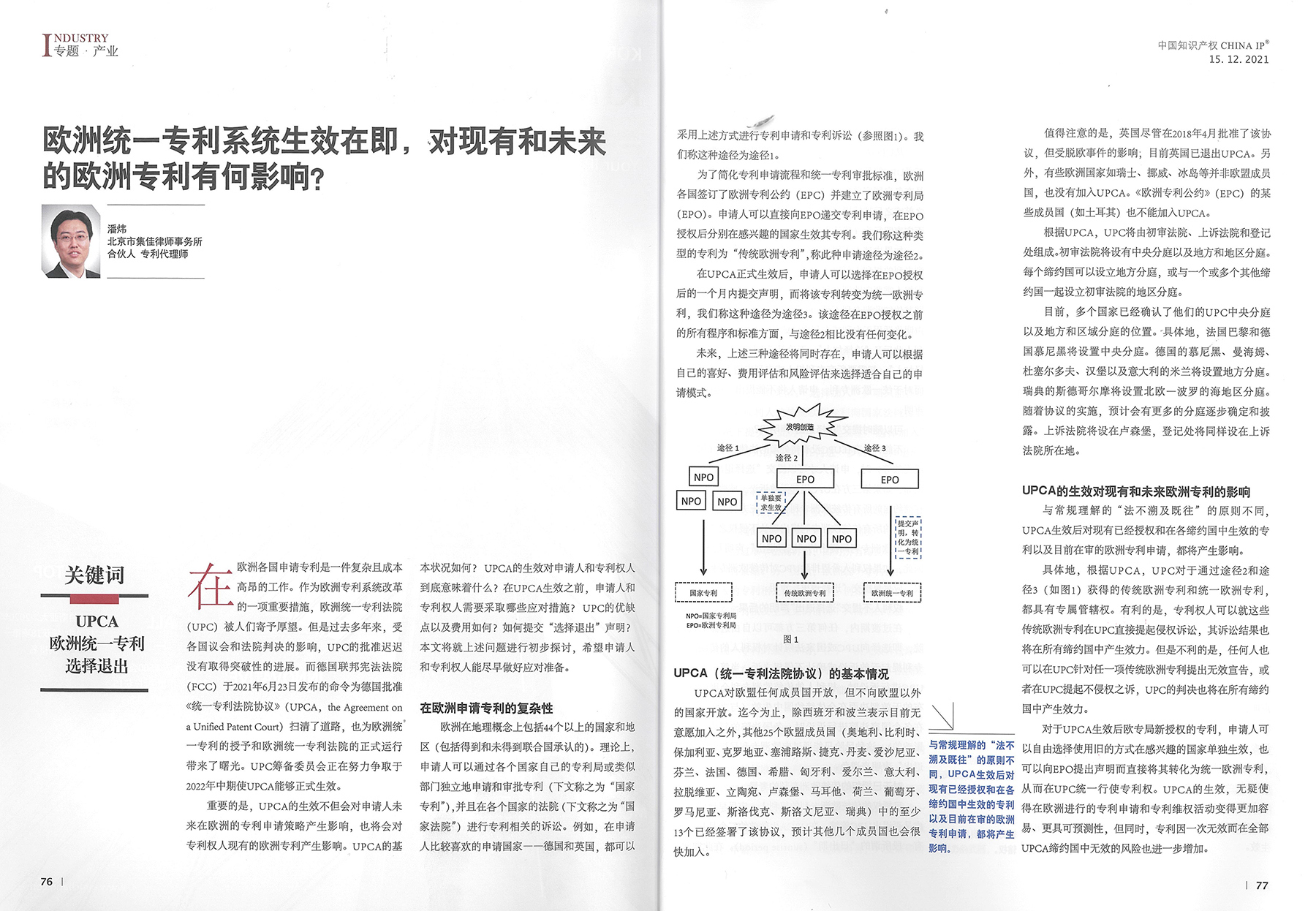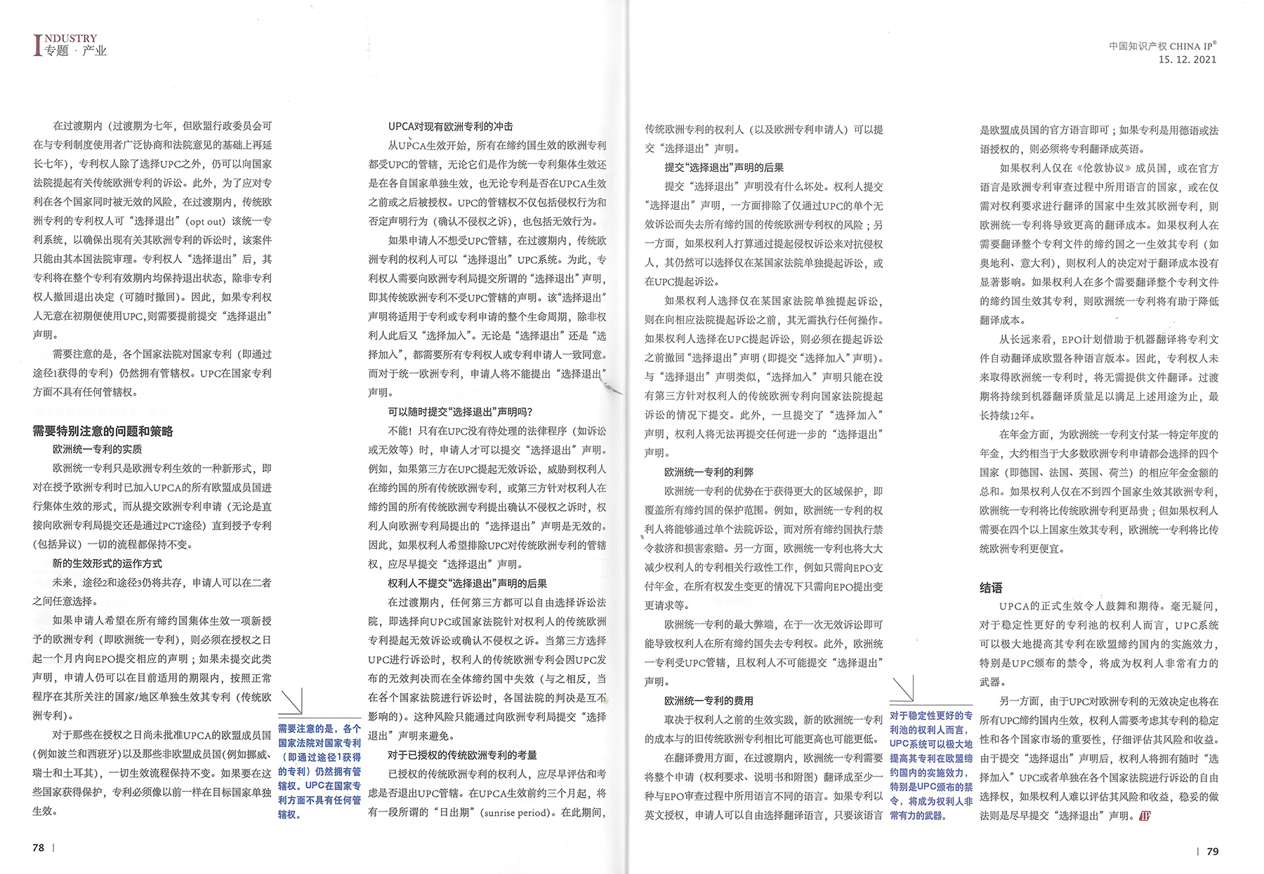 集佳文章《歐洲統(tǒng)一專利系統(tǒng)生效在即,對現(xiàn)有和未來的歐洲專利有何影響?》在《中國知識產(chǎn)權(quán)》發(fā)表