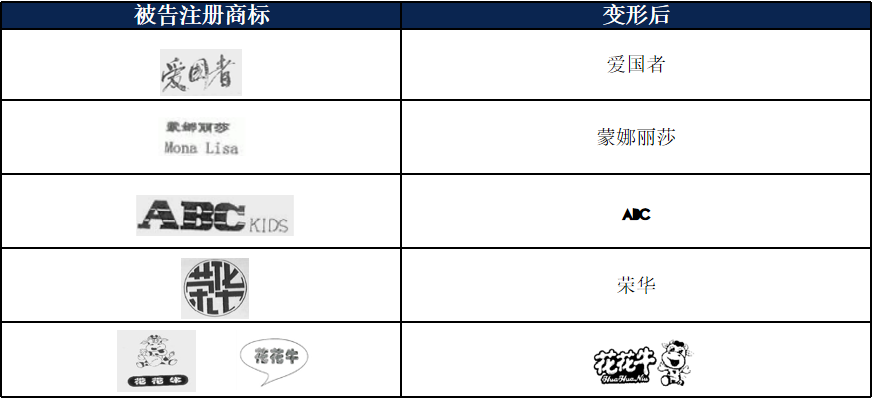 ”被認定構成“變形使用”、侵權成立。(2)若由于商業使用環境等客觀需要,導致被訴標識與注冊樣式稍有差別,一般不輕易判為“變形使用”,如“蒙娜麗莎”“愛國者”“ABC”等案件。法院認為,被訴標識雖與注冊商標有所差異,但未改變顯著特征,仍屬于對注冊商標的合理使用。