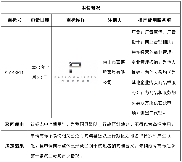 首先,“巴博羅”是佛山市富萊斯家具有限公司旗下的家具品牌,查閱佛山市富萊斯家具有限公司旗下的商標(biāo)注冊(cè)情況可知,其最早于2011年就提交了“巴博羅 PABLO CASA”商標(biāo)注冊(cè)申請(qǐng),隨后又申請(qǐng)注冊(cè)了多件“巴博羅 PABLO CASA”商標(biāo),能夠證明佛山市富萊斯家具有限公司使用“巴博羅 PABLO CASA”商標(biāo)已經(jīng)達(dá)十幾年之久。本案中申請(qǐng)商標(biāo)漢字為“巴博羅藝術(shù)館”,其屬于在“巴博羅”基礎(chǔ)上延伸的品牌,消費(fèi)者基于對(duì)“巴博羅”品牌的認(rèn)知,也會(huì)將“巴博羅藝術(shù)館”視為是“巴博羅”的系列商標(biāo)。雖然“博羅”是隸屬于廣東省惠州市轄區(qū)下的一個(gè)縣級(jí)城市名稱,但其作為縣級(jí)城市名稱并不被廣大消費(fèi)者所熟知,當(dāng)普通消費(fèi)者看到“博羅”二字時(shí),并不太可能將其誤認(rèn)是行政區(qū)劃名稱??梢?jiàn),“博羅”與“巴博羅藝術(shù)館”是能夠被區(qū)分開(kāi)來(lái),消費(fèi)者不會(huì)將二者混同。