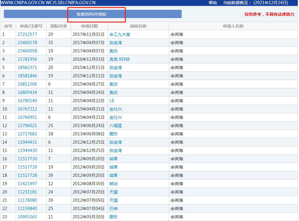 再次,經(jīng)查詢(xún)國(guó)家企業(yè)信用信息網(wǎng)和愛(ài)企查網(wǎng)站,爭(zhēng)議商標(biāo)原注冊(cè)人余英海名下無(wú)個(gè)體工商戶,也并不擔(dān)任任何企業(yè)的法人職務(wù),其不具有經(jīng)營(yíng)主體的資格,其申請(qǐng)注冊(cè)商標(biāo)并獲準(zhǔn)注冊(cè)的行為,屬于以商標(biāo)法第四十四條第一款規(guī)定的欺騙手段注冊(cè)商標(biāo)的情形。同時(shí),這進(jìn)一步印證了爭(zhēng)議商標(biāo)原注冊(cè)人余英海不以使用為目的大量注冊(cè)商標(biāo)的情形。