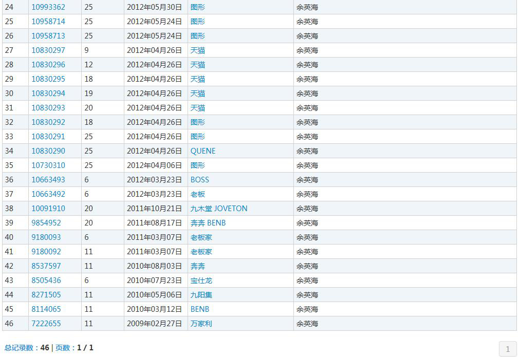 其次,針對(duì)訴爭(zhēng)商標(biāo)原注冊(cè)人余英海的惡意注冊(cè)行為,我方從以下幾個(gè)方面舉證證明。第一,訴爭(zhēng)商標(biāo)原注冊(cè)人余英海為自然人,自2009年2月27日至2017年11月1日,累計(jì)申請(qǐng)注冊(cè)了多達(dá)46件商標(biāo),其中18件商標(biāo)均已無(wú)效。其名下商標(biāo)涉及第6、7、9、11、12、18、19、20、24、25、35和39類(lèi)群組,這些商標(biāo)的差異較大,遠(yuǎn)遠(yuǎn)超出了實(shí)際使用的范疇,其行為屬于典型的不以使用為目的注冊(cè)商標(biāo)。