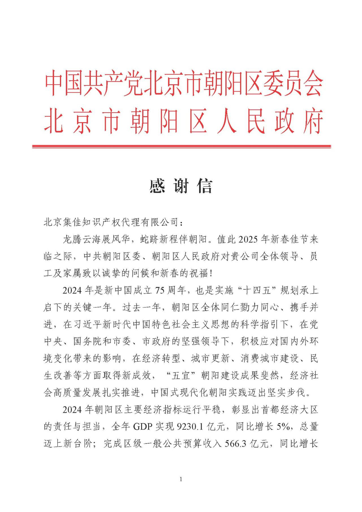 新春佳節(jié)來臨之際,集佳收到北京市朝陽區(qū)委、區(qū)政府發(fā)來的感謝信。信中,區(qū)委、區(qū)政府肯定和感謝了集佳過去一年為朝陽區(qū)經(jīng)濟(jì)社會發(fā)展作出的貢獻(xiàn),并對集佳全體領(lǐng)導(dǎo)、員工及家屬致以誠摯的問候和新春的祝福!