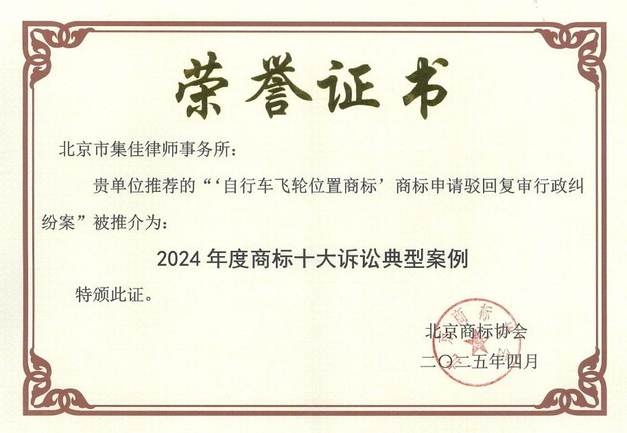 4月27日,北京商標協會發布2024年度北京商標十大訴訟典型案例,其中,集佳代理的斯拉姆有限責任公司(SRAM,LLC)訴國家知識產權局關于第G1729330號“自行車飛輪位置商標”商標申請駁回復審行政糾紛一案成功入選。