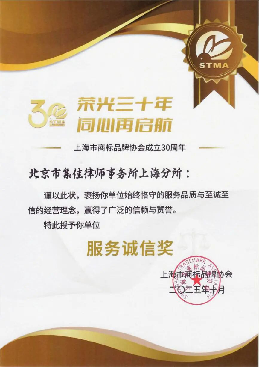 On October 16, 2025, the 30th Anniversary Celebration of the Shanghai Trademark Brand Association — "Glorious 30 Years, Setting Sail Again with One Heart" — grandly commenced in Shanghai. At the ceremony, organizations and individuals who had made outstanding contributions to the trademark and brand sector were honored, and awards were presented for 2024-2025 Exemplary Trademark Agency Cases and Nominated Exemplary Trademark Agency Cases.